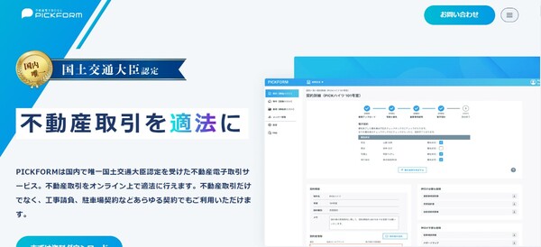 PICKFORMは、不動産電子取引サービスの中では唯一、国土交通大臣の認定を受領しているサービスです。国土交通省マニュアルと宅建業法に対応し、不動産取引に特化したサービスになっています。